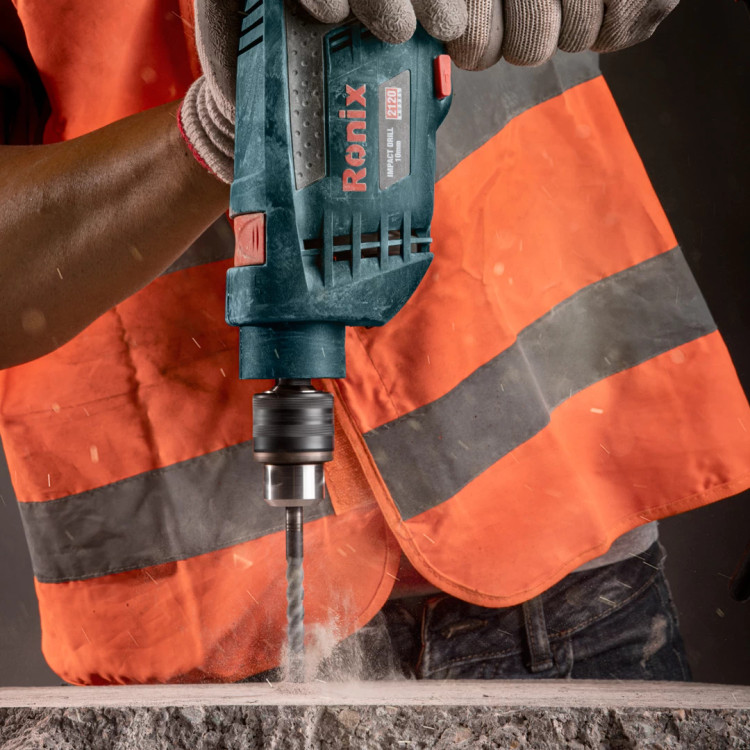 دریل چکشی 2120 رونیکس، با موتور قدرتمند 750 وات کار میکند که مجهز به آرمیچر و بالشتکهای صنعتی است. این قطعات مطابق آخرین استانداردهای روز دنیا ساخته شدهاند. این دریل، با ترکیب دو نیروی چرخشی و ضربهای، سوراخکاری معمولی و سوراخکاری چکشی را در سطوح بسیار سخت مانند انواع دیوار به آسانی انجام میدهد. حداکثر سرعت گردش در این دریل چکشی پرقدرت 2800 دور بر دقیقه است که به وسیله کلید الکترونیک دیمردار تنظیم میشود.