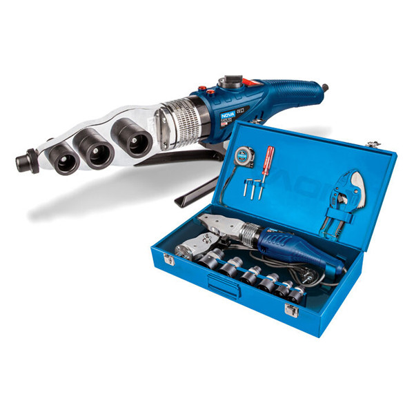 به همراه : 6 عدد لقمه 20 میلی متری ، 25 میلیمتری ، 32 میلی متری و 40 میلی متری - 1 عدد صفحه حرارتی اضافه ( راکت )- 1 عدد قیچی PVC بر - 1 عدد متر ۳ متری - 1 عدد پیچ گوشتی 4 سو نووآ - 2 عدد آچار آلن - پایه آلومینیومی - کیف فلزی