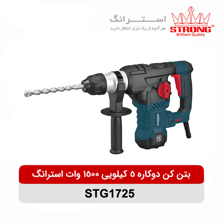 بتن کن دوکاره 5 کیلویی 1500 وات استرانگ مدل STG1725 دارای قدرتی معادل 1500 وات است و در فرکانس کاری 50 هرتز و ولتاژ 220 ولت کار میکند. بتن کن دوکاره 5 کیلویی 1500 وات استرانگ با آرمیچر های با کیفیت و 100% مسی مطابق استاندارد CE اتحادیه اروپا نخ بندی شده است. دسته کمکی این محصول قابلیت چرخشس 360 درجه ای را دارا میباشد. وزن بتن کن دو کاره استرانگ برابر 5.3 کیلوگرم است، همچنین دارای کیف بی ام سی (BMC) و لوازم جانبی دیگر میباشد.