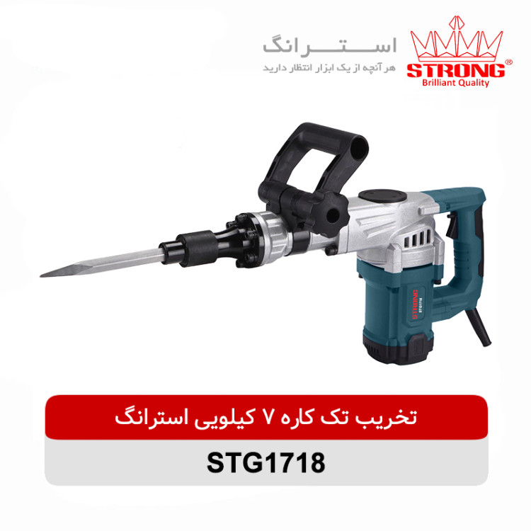 تخریب تک کاره 7 کیلویی 1300 وات استرانگ مدل STG1718 در فرکانس کاری 50 هرتز و ولتاژ 220 ولت کار میکند. حداکثر سرعت ضربه برای این بتن کن استرانگ برابر 3900 bpm است. موتور این دستگاه تخریب تک کاره با آرمیچر های با کیفیت و 100% مسی مطابق استاندارد CE اتحادیه اروپا نخ بندی شده است. دسته کمکی این محصول قابلیت چرخش 360 درجه ای را دارا میباشد همچنین مجهز به کیف بی ام سی و لوازم جانبی دیگر میباشد. قدرت ضربه برای تخریب تک کاره 7 کیلویی 1300 وات استرانگ مدل STG1718 برابر 15 ژول و قلم گیر آن 6 پر میباشد. این دستگاه مجهز به قفل کن کلید، سیستم ضد لرزش و سه نظام اتوماتیک میباشد.