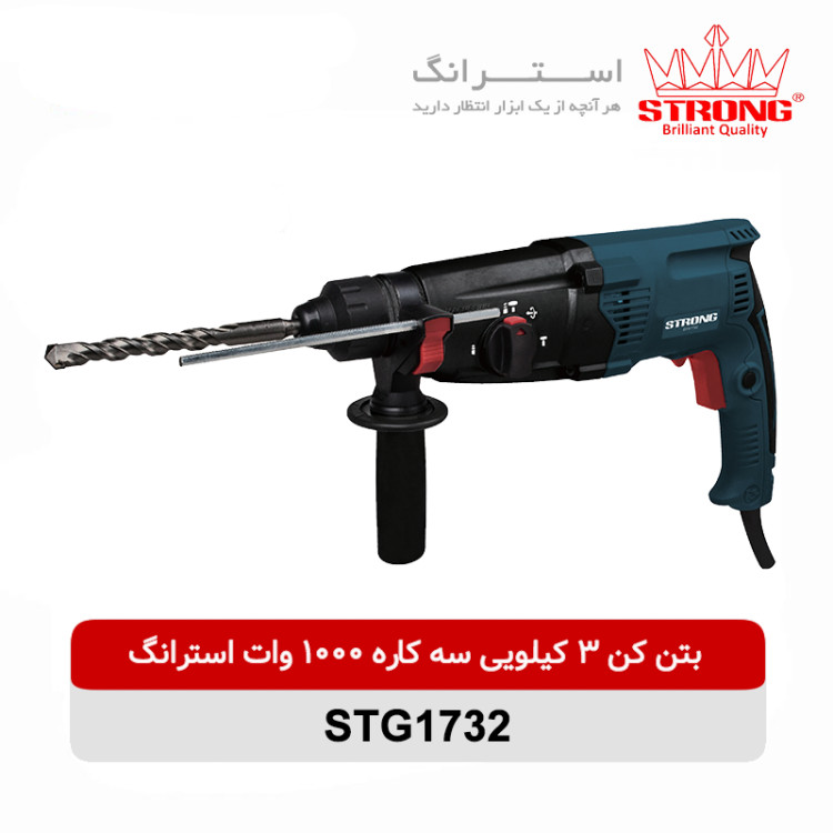 بتن کن 3 کیلویی سه کاره اتومات 1000 وات استرانگ مدل STG1732 در فرکانس کاری 50 هرتز و ولتاژ 220 ولت کار میکند. حداکثر سرعت ضربه برای این بتن کن استرانگ برابر 4900 bpm است. موتور بتن کن سه کاره 3 کیلویی 1000 وات استرانگ با آرمیچر های با کیفیت و 100% مسی مطابق استاندارد CE اتحادیه اروپا نخ بندی شده است. دسته کمکی بتن کن 3 کیلویی سه کاره چهار شیار 1000 وات استرانگ مدل STG1732 قابلیت چرخش 360 درجه ای را دارا میباشد همچنین مجهز به کلید راست گرد و چپ گرد میباشد. سرعت گردش آزاد برای این محصول 1100 دور در دقیقه و قدرت ضربه آن برابر 3.3 ژول میباشد. کیف بی ام سی، ذغال صنعتی، مته و قلم از دیگر لوازم جانبی همراه این محصول میباشد.