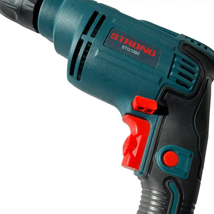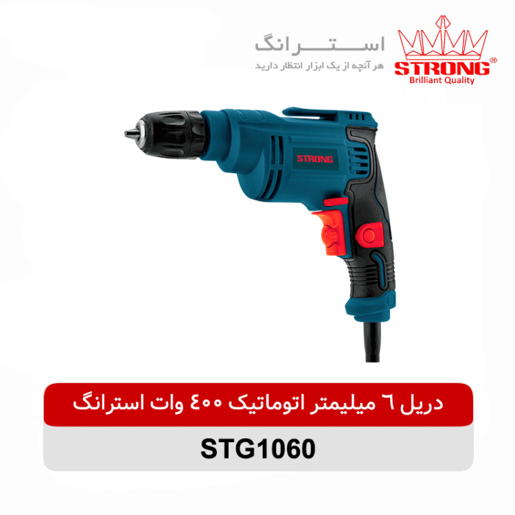 دریل 6 میلیمتر 400 وات اتوماتیک استرانگ مدل STG1060 یک دریل ساده است که دارای سه نظام 6 میلیمتری اتوماتیک است. این محصول دارای موتور پرقدرت و بادوام و همچنین مجهز به آرمیچر و بالشتک های صنعتی مطابق با استاندارد CE با بالاترین کیفیت سیم پیچی می باشد. طراحی ارگونومیک بدنه موجب سهولت در کاربری این دریل شده است. این دریل مجهز به کلید ضد غبار راست گرد و چپ گرد است که می توان از آن برای باز و بسته کردن پیچ ها نیز استفاده نمود. همچنین شصتی این دستگاه دارای دیمر تنظیم سرعت است که سرعت آن را تنظیم می کند.