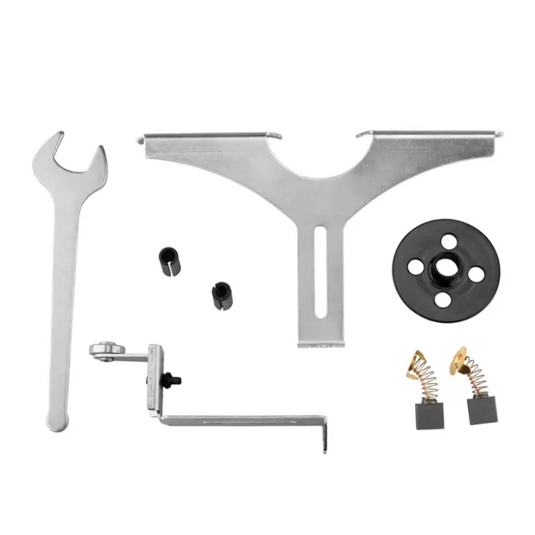 چار 24 میلیمتری -2 عدد کولت در سایزهای 6 و8- آچار-گونیا- نگهدارنده گونیا (ثابت روی دستگاه ) - راهنمای الگوی برش - راهنمای لبه گیری - ذغال