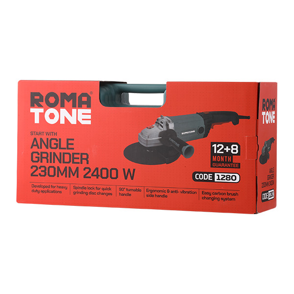 طراحی ارگونومیک بدنه و دستههای فرز سنگبری ۲۴۰۰ وات روماتون، باعث کاهش چشمگیر فشار به کاربر حین اجرای فرایند است. قابلیت چرخش ۹۰ و ۱۸۰ درجه دسته این ابزار، باعث کنترل چند برابری دستگاه توسط کاربر میشود. همچنین دسته کمکی ارگونومیک این فرز سنگبری، علاوهبر خاصیت ضد تعریق بودن، دارای سه جهت محتلف برای اتصال به بدنه است. همچنین کلید قفل کن این دستگاه، برای عملیاتی تعبیه شده که نیاز به کارکرد پیوسته دارد و کاربر مجبور به فشار مداوم کلید نیست.