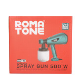 پیستوله برقی ۵۰۰ وات روماتون، سیستم رنگپاشی HVLP را اجرا میکند که در لغت به معنای «حجم بالا، فشار کم» است. در این سیستم، رنگ با غلظت بیشتر توسط فشار کمتر هوا پاشش میشود. براساس این نوع کارکرد، هوای فشرده به رنگ داخل مخزن وارد شده و پس از اتمیزه شدن یا تبدیل به ذزات بسیار ریز، توسط نازل و بهوسیله اسپری گان، به سطح مورد نظر میپاشد. بنابراین با توجه به حجم بیشتر رنگ عبوری، برای این نوع پیستوله رنگ میبایست از مجاری و نازلهایی با سایز بزرگتر استفاده شود. همچنان که نازل تعبیه شده برای پیستوله برقی ۵۰۰ وات روماتون، دارای سایز ۲/۶ است.