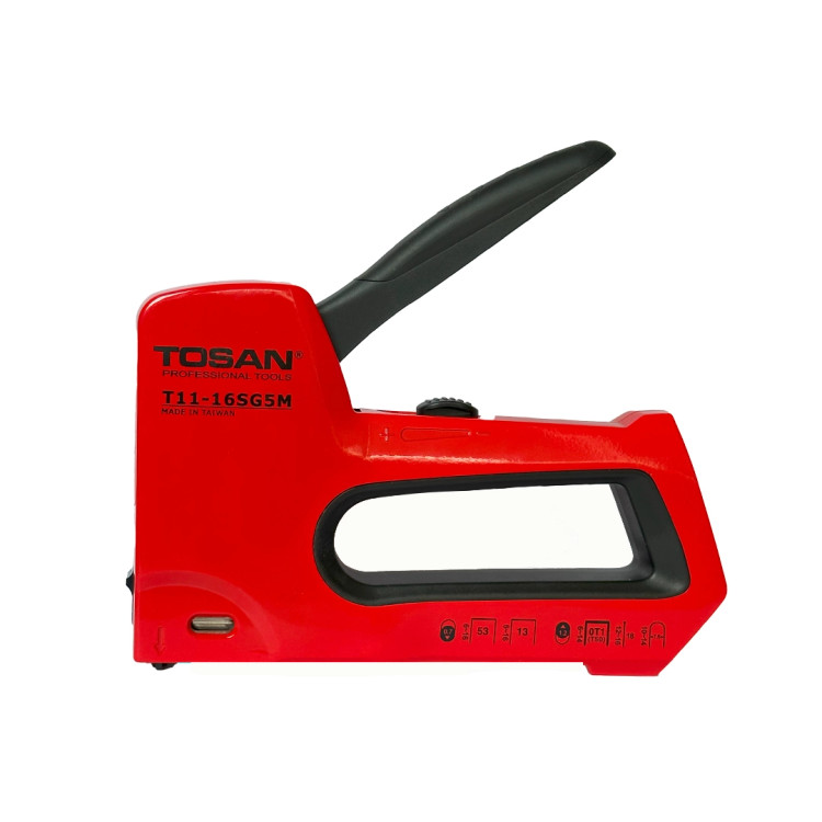 ابزار منگنه کوب دستی توسن، مدل T11-16SG5M با وزنی معادل 504 گرم و بدنه آلومینیومی، قابلیت استفاده از 5 مدل میخ و منگنه زیر را دارد: