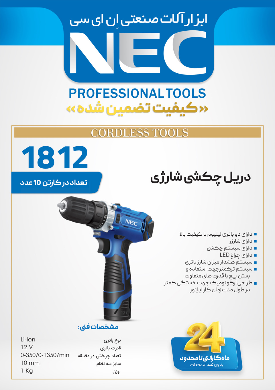 دریل پیچگوشتی 1812NEC، بررسی دریل شارژی 18 ولت NEC، قیمت دریل پیچگوشتی 1812NEC، مقایسه دریلهای 18 ولت، بهترین دریل پیچگوشتی نیمهحرفهای، مشخصات فنی 1812NEC، خرید دریل قدرتمند و سبک، تفاوت 1812NEC با مدلهای مشابه، دریل پیچگوشتی با کولت سریع.
