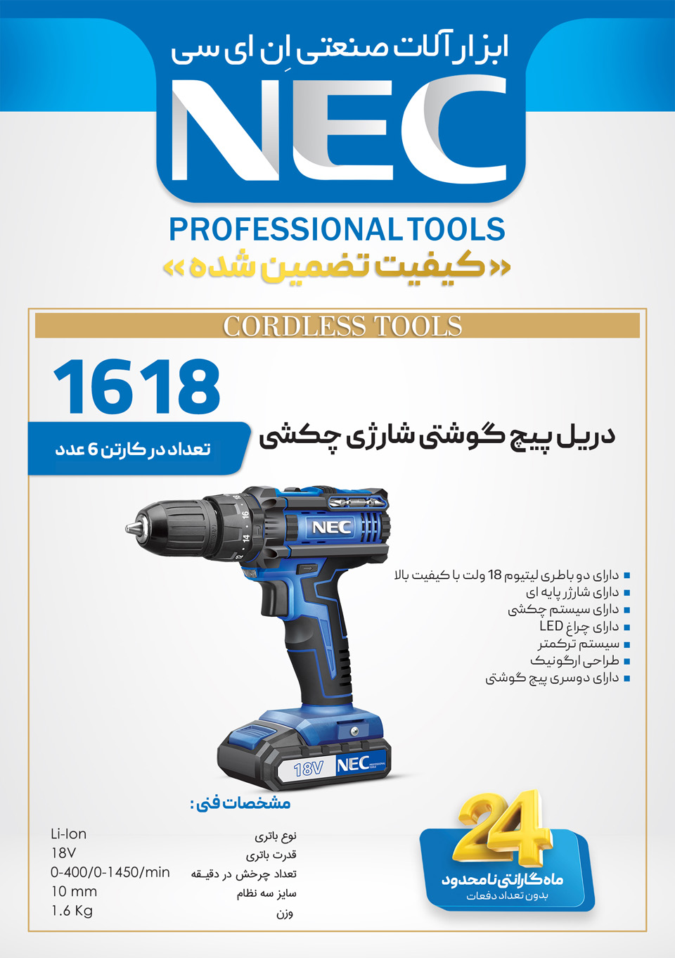 دریل شارژی 1618NEC، قیمت دریل 18 ولت NEC، مشخصات فنی دریل 1618NEC، مقایسه دریلهای دوگانه 16-18 ولت، خرید دریل حرفهای NEC، بررسی تخصصی مدل 1618NEC، بهترین دریل نجاری 2024، تفاوت 1618NEC با مدلهای مشابه، سیستم ولتاژ هوشمند در دریلها، دریل با باتری دوبل 1618NEC.