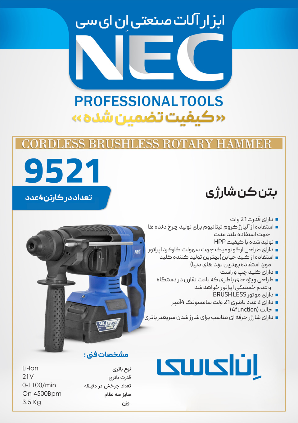 دریل بتن کن **مدل B9521 NEC** یک ابزار **نیمه حرفه ای تا حرفه ای** برای کارهای سنگین ساختمانی است که برای **سوراخکاری در بتن، سنگ و مصالح سخت** طراحی شده است. این مدل با **قدرت ضربه بالا و موتور قدرتمند**، یکی از گزینههای محبوب در بازار ابزار ایران محسوب میشود.