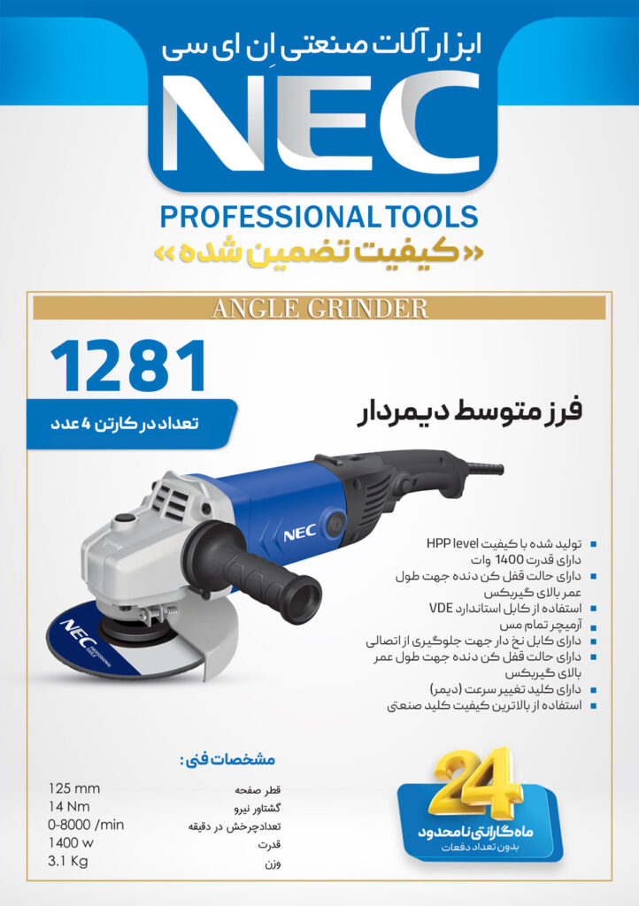 مینی فرز **1281NEC** جدیدترین مدل پیشرفته این برند با **قدرت 1100 وات** و **سایز دیسک 125 میلیمتری** است که برای کارهای سنگین صنعتی طراحی شده. این مدل با **فناوری کاهش لرزش پیشرفته** و **سیستم خنککاری هوشمند**، تحولی در عملکرد دستگاههای این رده ایجاد کرده است.